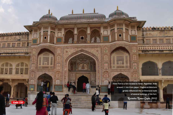 Amer Fort is a fort located in Amer, Rajasthan, India around 11 km from Jaipur. Mughal architecture greatly influenced the architectural style of several buildings of the fort