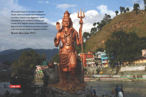 Tall beautiful statue of Lord Shiva in Bagnath Temple which is an ancient shrine dedicated to Lord Shiva, situated in the Bageshwar city of Uttarakhand at the confluence of Sarayu and Gomati rivers. Bagnath Temple is festooned with bells of all sizes and features impressive carvings.It is the most famous Temple in Bageshwar District.