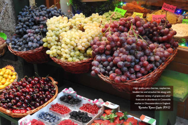 High quality juicy cherries, raspberries, blueberries and strawberries along with different variety of grapes and other fruits are in abundance in Cotswolds market in Gloucestershire in England.